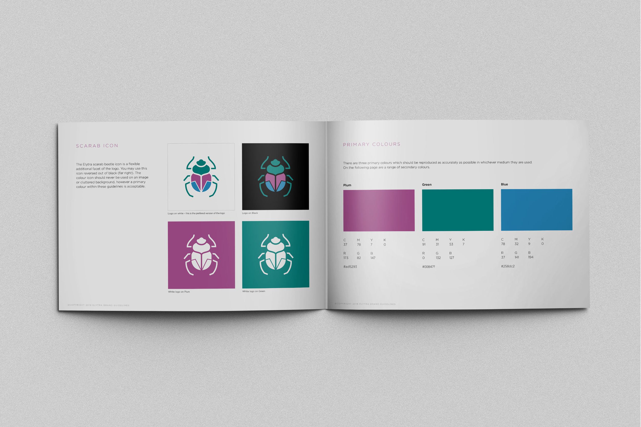 The end result was a custom typeface called Elytra Sans. This enabled us to create a wordmark that works organically with or without the scarab. This also enabled us to create two versions of the scarab. One with the wings open as if in flight and one that is closed that can be used in isolation, for example, on social media profile pictures or on the back of the business cards with the strapline.